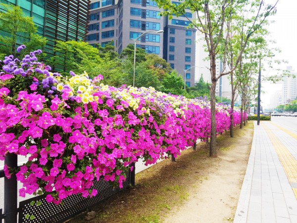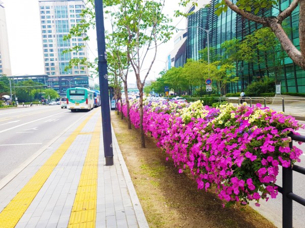 2018년 상반기 구로구 버스정류장과 공구상가 담벼락에 난간걸이화분을 설치하였습니다.