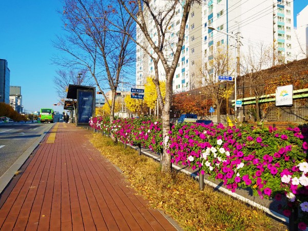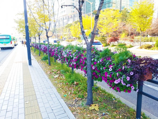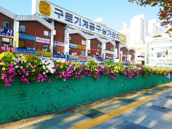 2018년 하반기 구로구 버스전용차로와 공구상가 담에 난간걸이화분을 설치하였습니다.