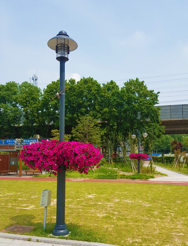 2018년 상반기 군포시 철쭉공원에 가로등걸이화분을 설치하였습니다.