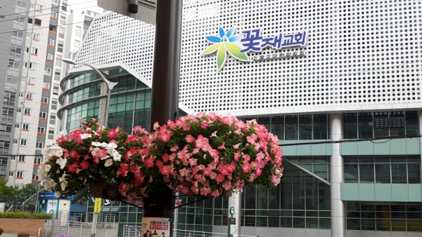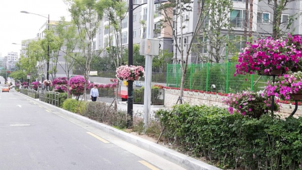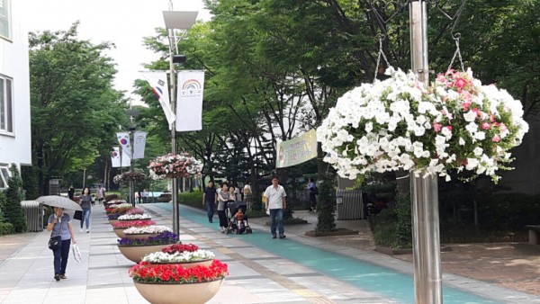 2016년 상반기 성동구청앞과 꽃재교회 인근 가로등에 꽃사각걸이화분을 설치하였습니다.