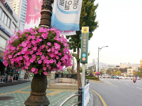 2015년 하반기 용산구청 관할 대로변에 가로등걸이화분을 설치하였습니다.